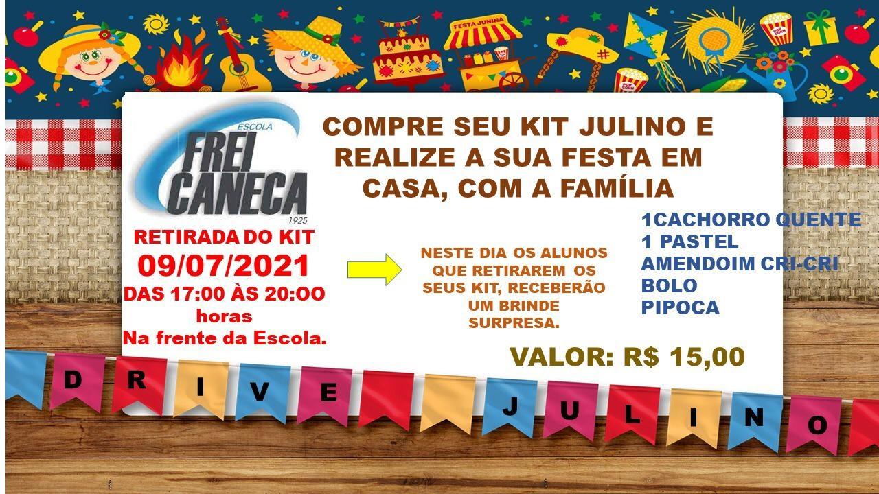 A Escola Frei Caneca está realizando um Drive Julino com venda de kit para realizar uma festa junina em casa. O kit é composto por um cachorro quente, um pastel, amendoim cri-cri, bolo e pipoca.