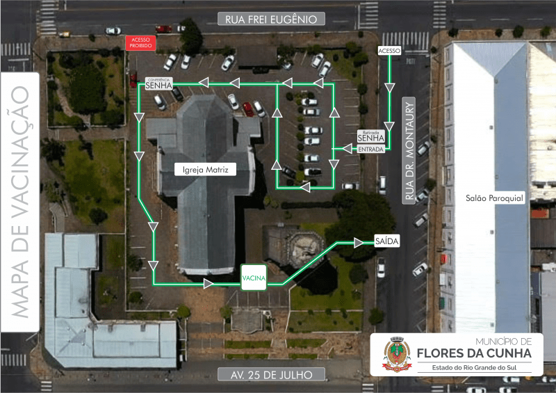 A entrada será pelo estacionamento da Igreja Matriz na Rua Dr. Montaury, em frente ao portão lateral do Salão Paroquial. O carro irá contornar a Igreja por dentro do estacionamento e a vacinação será próxima ao campanário. Após a imunização, o carro sairá pela frente da Igreja, também na Rua Dr. Montaury.