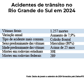 De acordo com dados da Polícia Rodoviária Federal (PRF), em 2024, foram registrados 73.121 acidentes nas rodovias federais, resultando em 6.160 mortes e 84.489 feridos. Esse foi o quarto ano consecutivo de aumento no número de óbitos, com um aumento de 10% em comparação com 2023. No Rio Grande do Sul, 1.257 pessoas morreram em acidentes de trânsito em 2024.