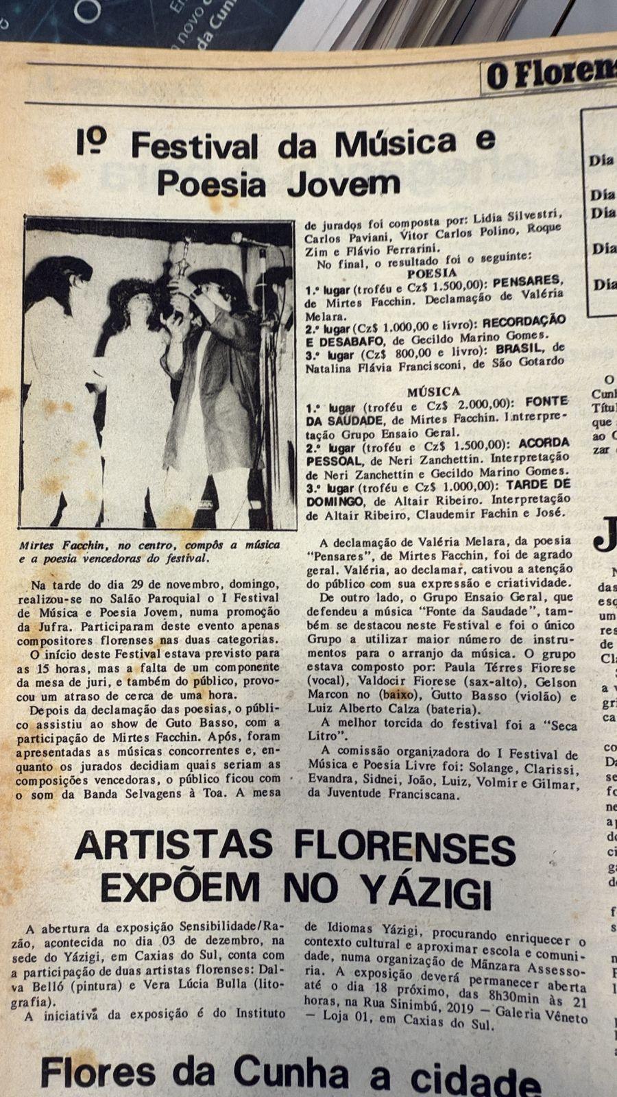 O 1º Festival da Música e Poesia Jovem, realizado em 29 de novembro de 1987, marcou todos aqueles artistas que subiram ao palco, movidos pela vontade de expressar o espírito de suas emoções. A lembrança desse momento está eternizada nas páginas d’O Florense, edição de número 31. Lá está Mirtes Facchin, vencedora das duas categorias do festival com a música “Fonte da Saudade” e a poesia “Pensares”.