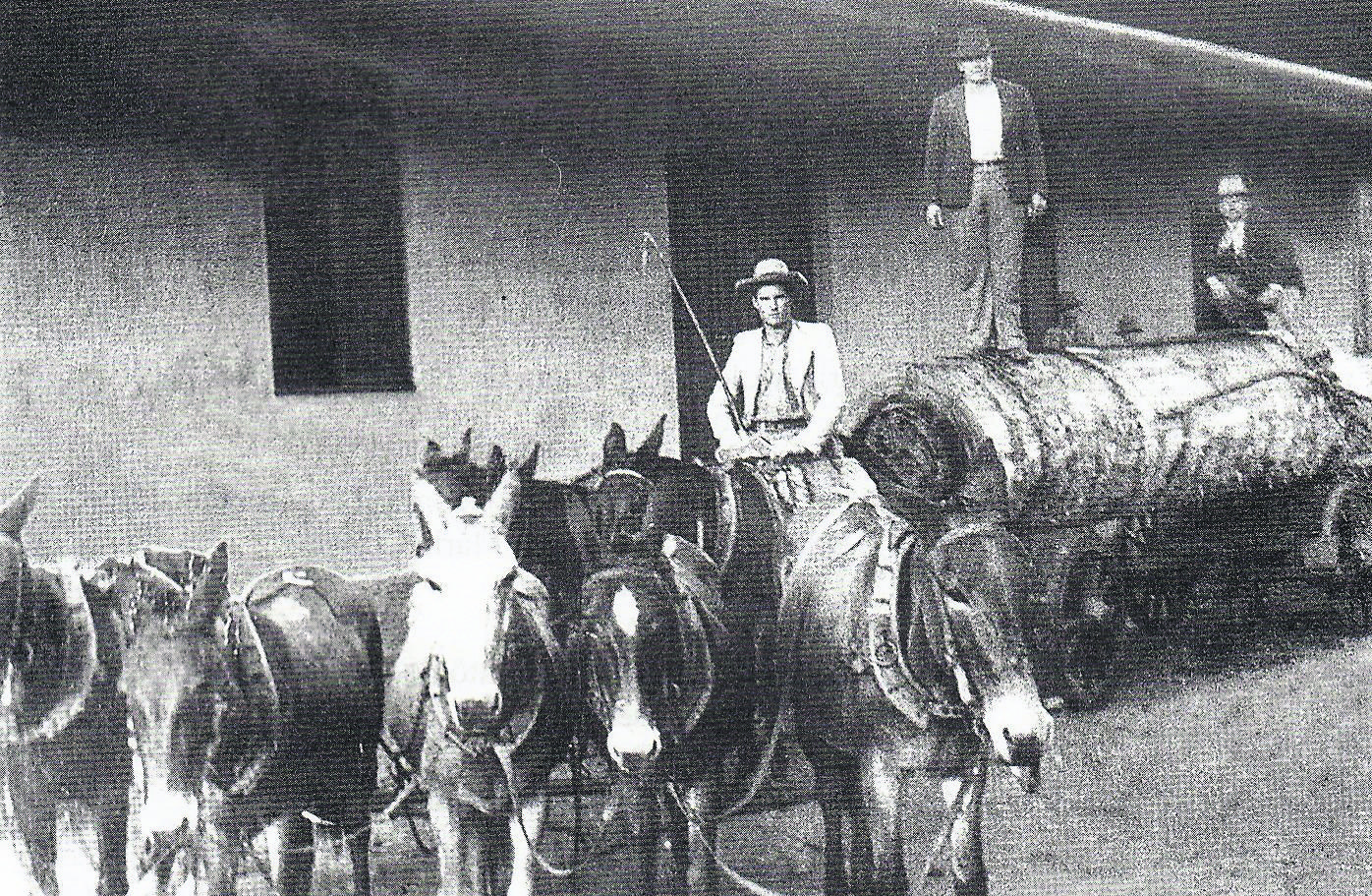 O corte rudimentar do pinheiro, utilizando uma serra movimentada por duas pessoas. (Foto: Reprodução)